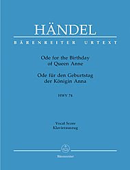 Ode for the Birthday of Queen Anne HWV 74?Vocal Score based on the Urtext of the Halle Handel Edition. (German/ English) Edition : Piano Reduction/Vocal ScoreEditor : Siegmund-Schultze, WaltherBinding : paperboundInstrumentation : Soprano solo, Alto solo, Tenor solo, Bass solo, Mixed Choir-SATB, 2 Oboe, Bassoon, 2 Trumpet, Strings, Basso continuoDuration : 22'